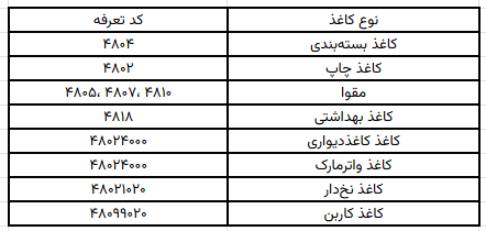این هزینهها شامل دریافت مجوزهای مختلف، گواهینامهها، مالیات بر ارزش افزوده، هزینههای گمرکی و… هستند. علاوه بر این هزینهها، شما باید کاغذ را از تأمینکننده بخرید و هزینه آن را نیز بپردازید. بنابراین، قبل از تصمیم برای واردات باید این هزینهها را بهطور دقیق محاسبه کنید و سپس کار واردات را انجام دهید. در جدول زیر انواع کاغذ وارداتی را به همراه کد تعرفه آنها برای شما آوردهایم: